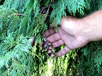 over we go. Our GPSs took us right to the tree and the search begins. The trees planted here along the canal are memorials for past loved ones and we found the family tag and thought we had found the cache. It wasn’t until we moved a few more boughs that we saw something that didn’t belong – a pine cone in a weeping cedar tree!